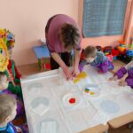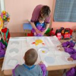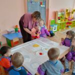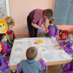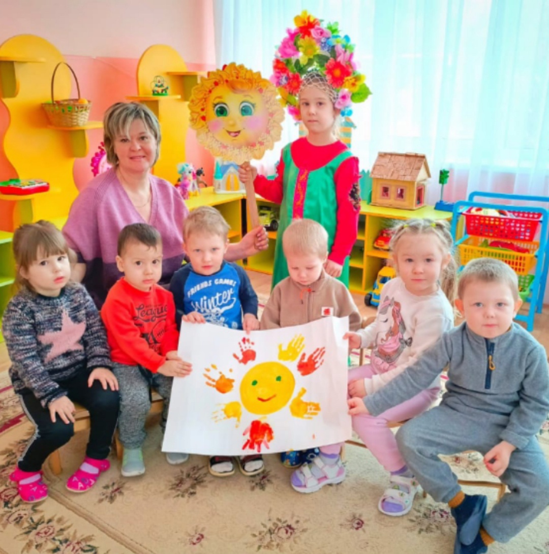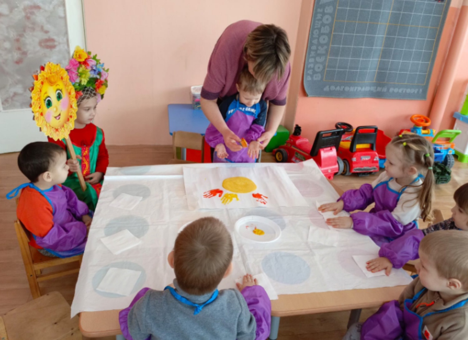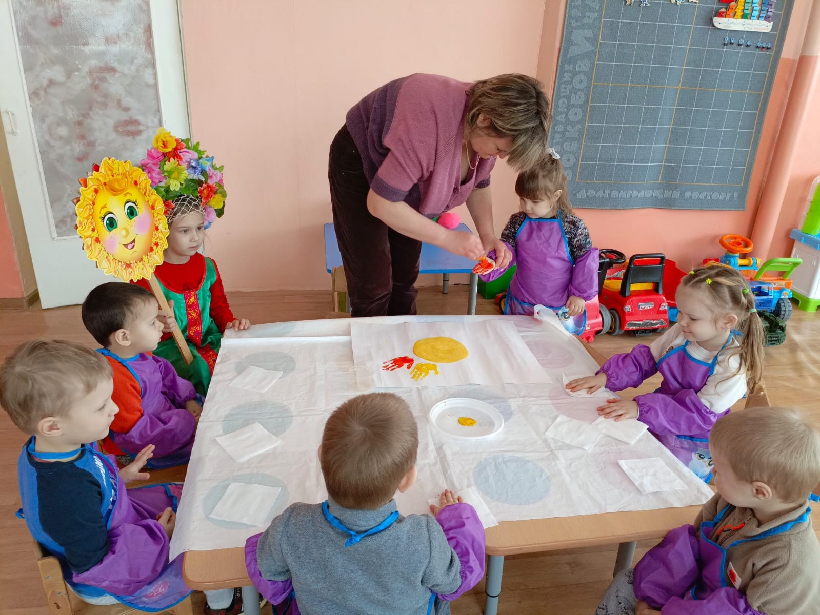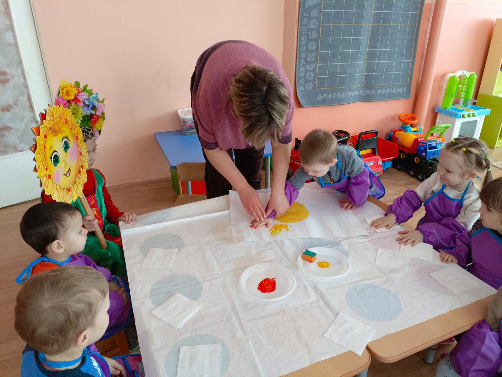 Вместе с Весной и воспитателем малыши нарисовали отпечатками ладошек яркое солнышко. Теперь в группе стало еще светлее и теплее.