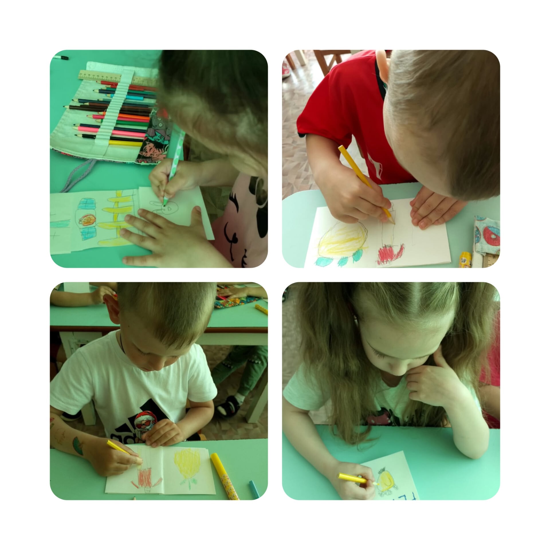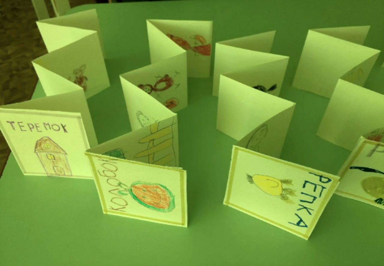 Во второй части занятия ребята сделали книжки-раскладушки по мотивам любимых русских-народных сказок, на обложках написали названия.