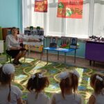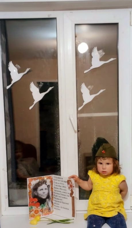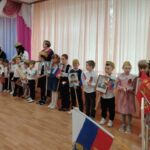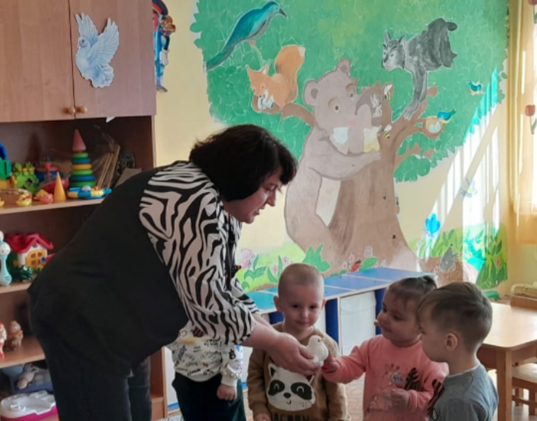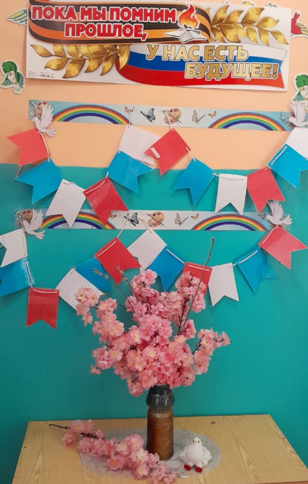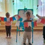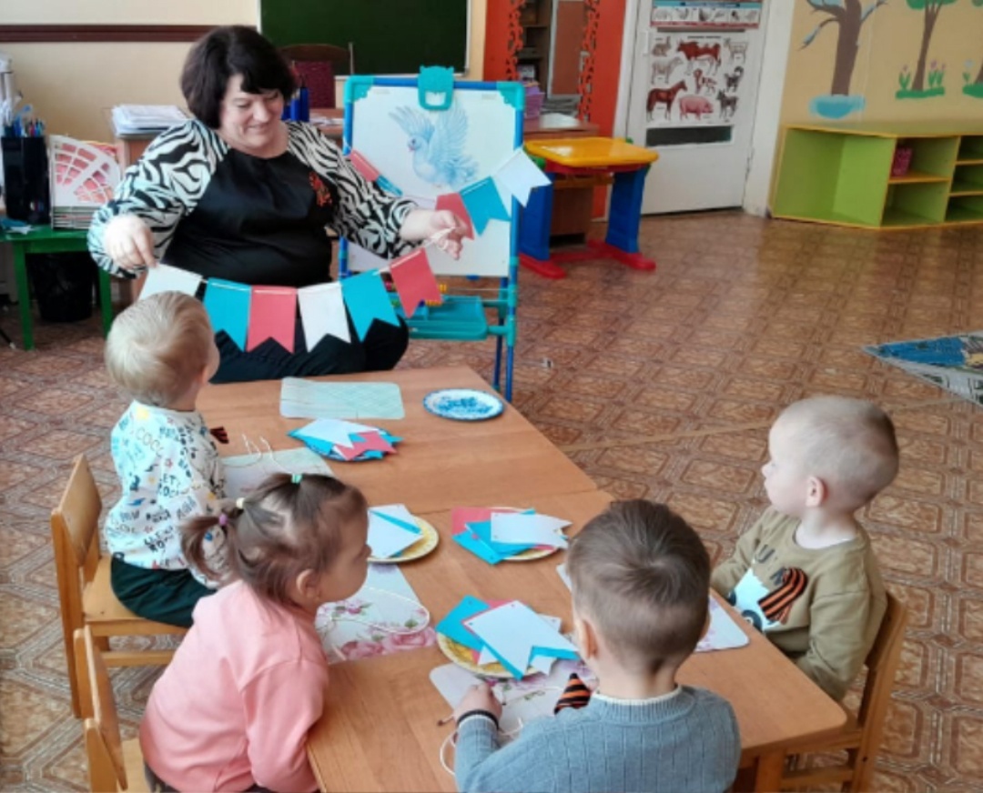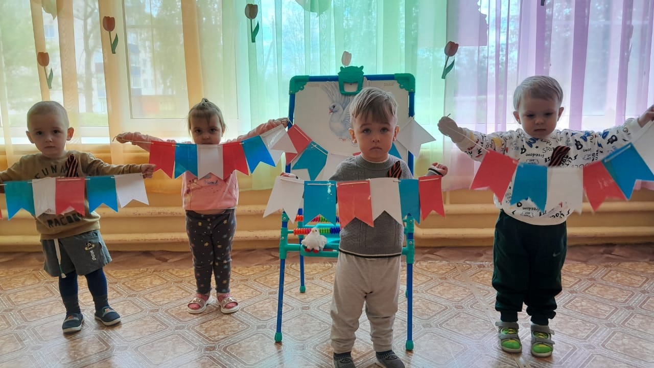 В гости к малышам прилетел «голубь мира». Он рассказал детям о празднике «День Победы». Ребята вместе с голубем сделали праздничные флажки в цветах российского флага, поиграли в подвижную игру «Угадай цвет и повтори движение».