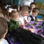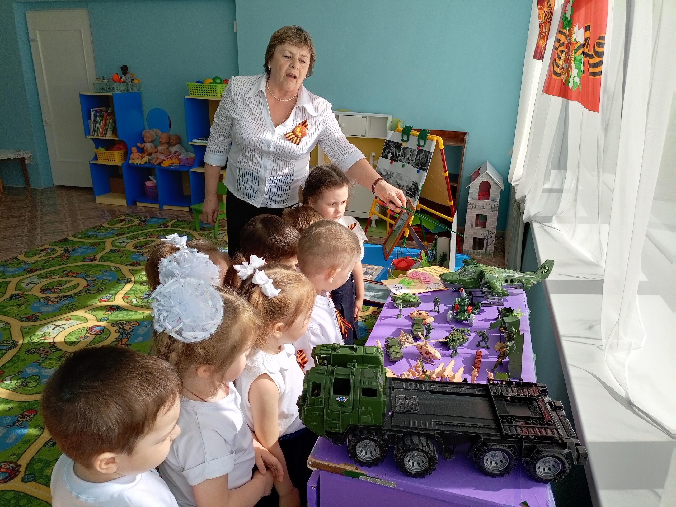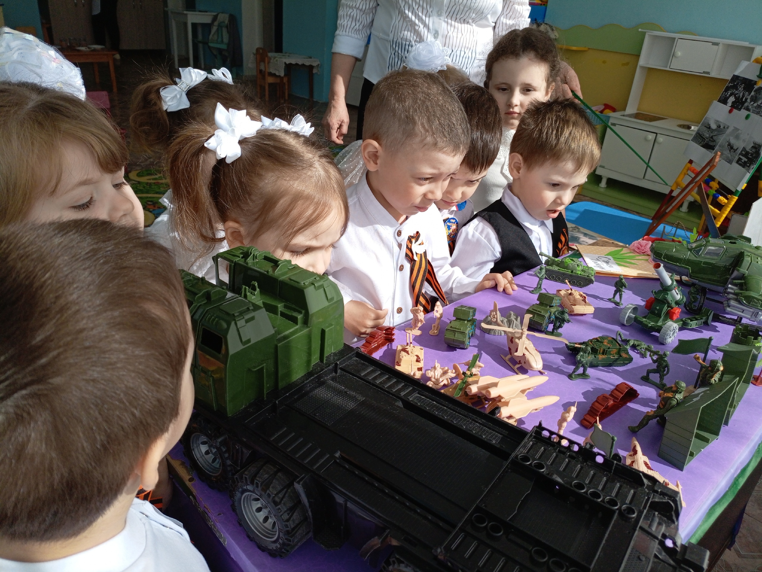 К занятию в группе была оформлена выставка игрушек «Военная техника». Ребята с удовольствием называли экспонаты, с интересом рассматривали их.
