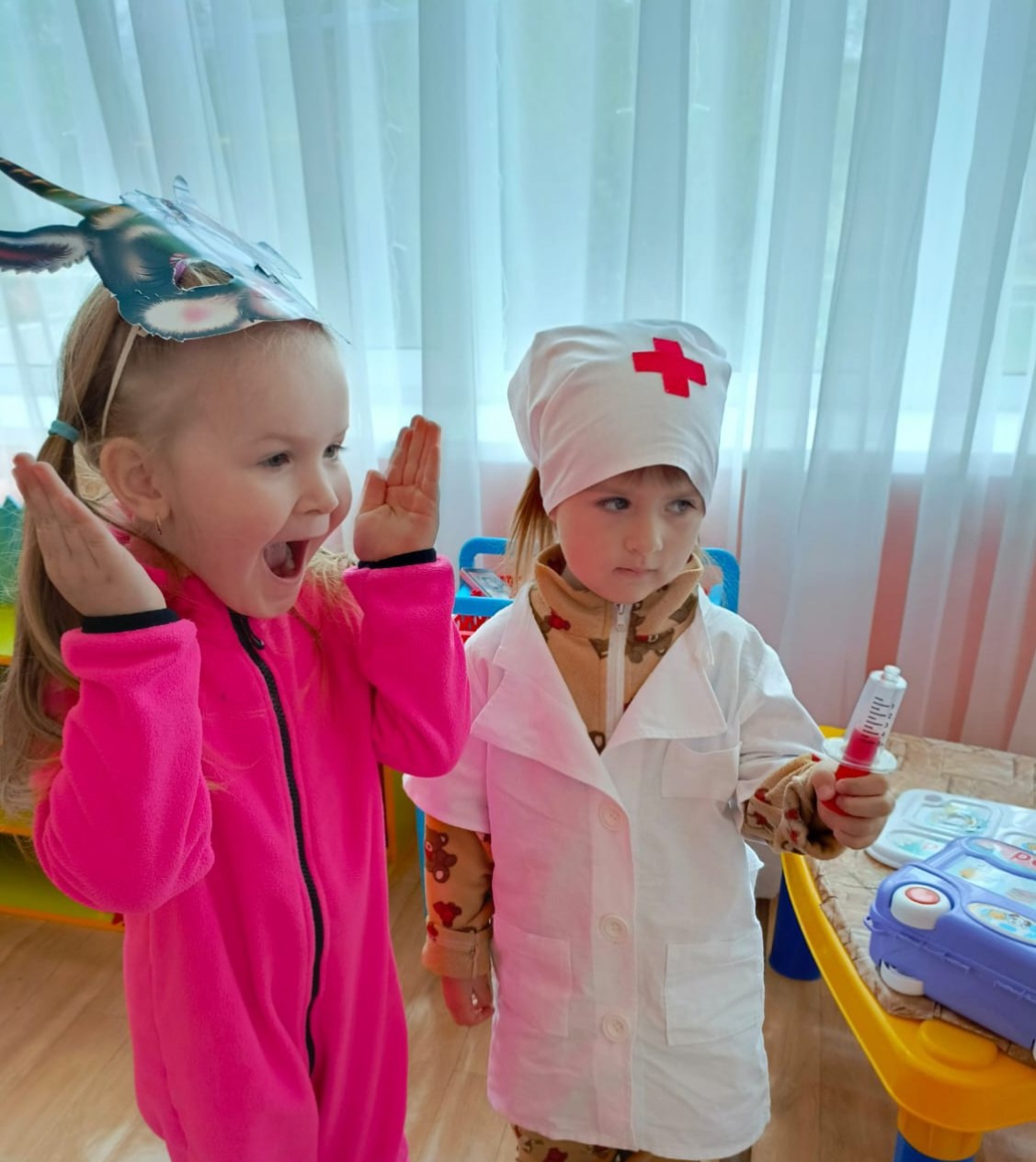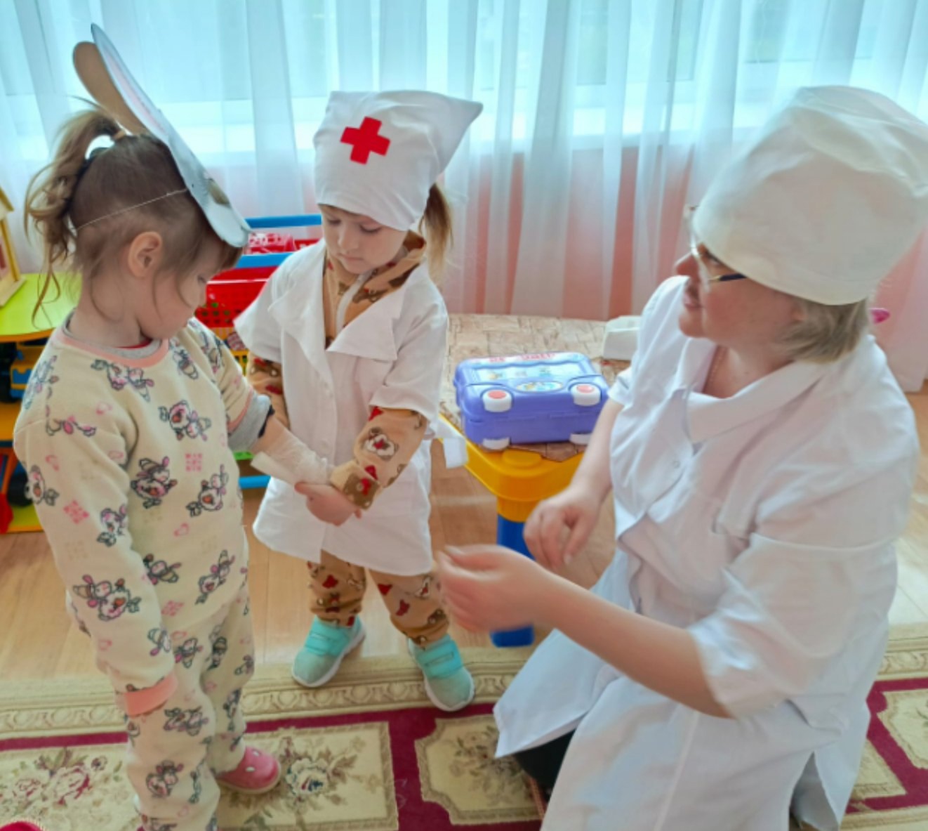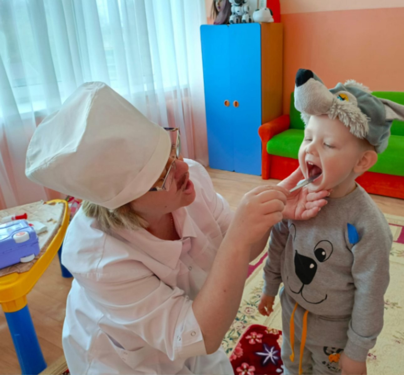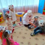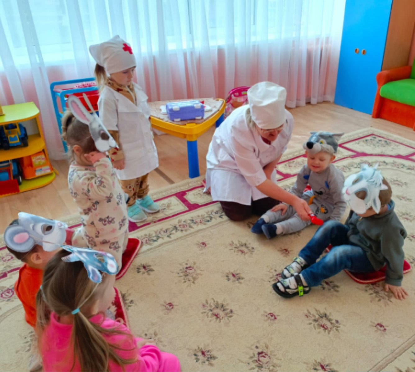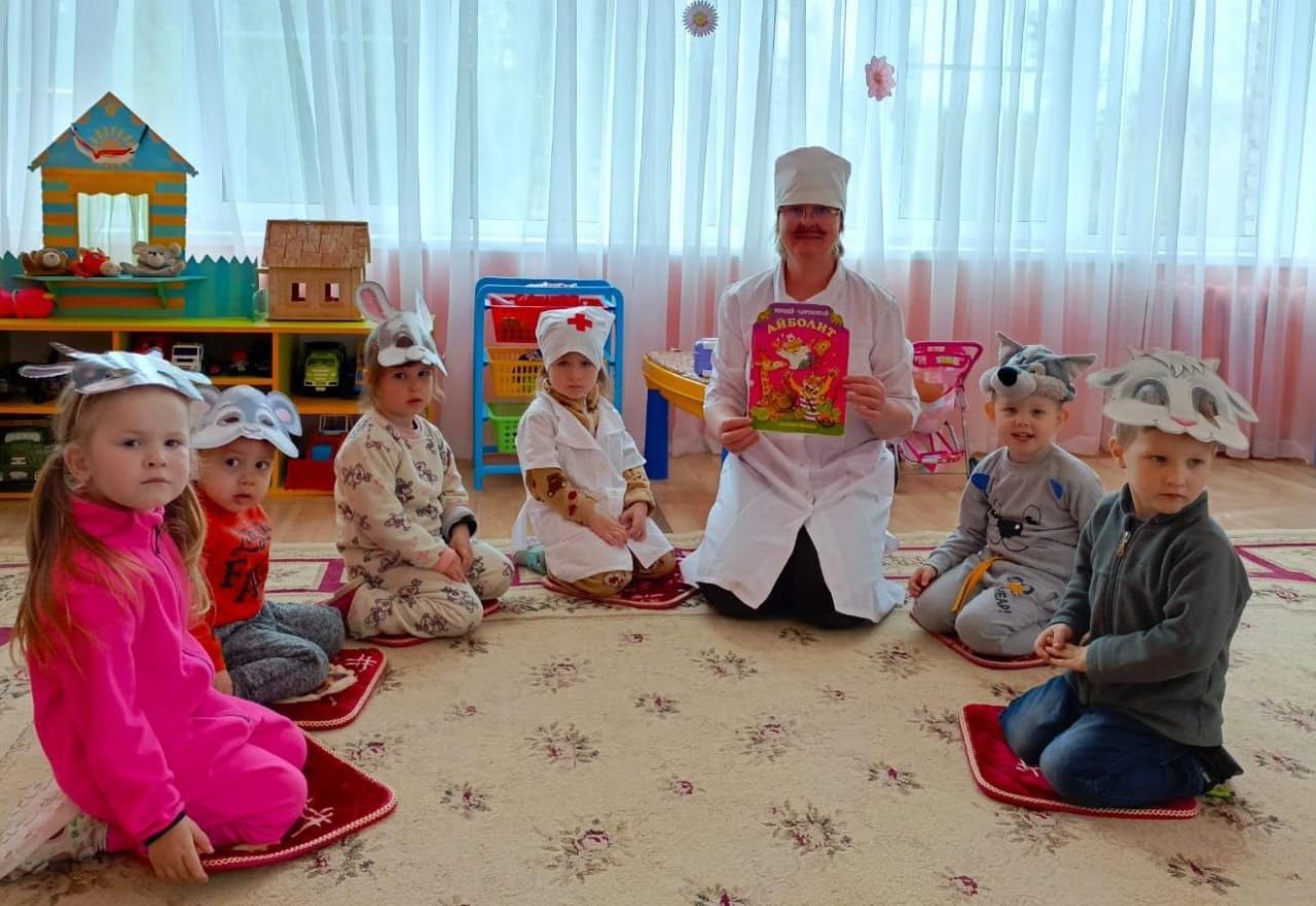 В гости к малышам приехал Доктор Айболит. Он предложил ребятам отправиться в гости в известную сказку «Айболит». Малыши с большим удовольствием на время превратились в сказочных зверей.