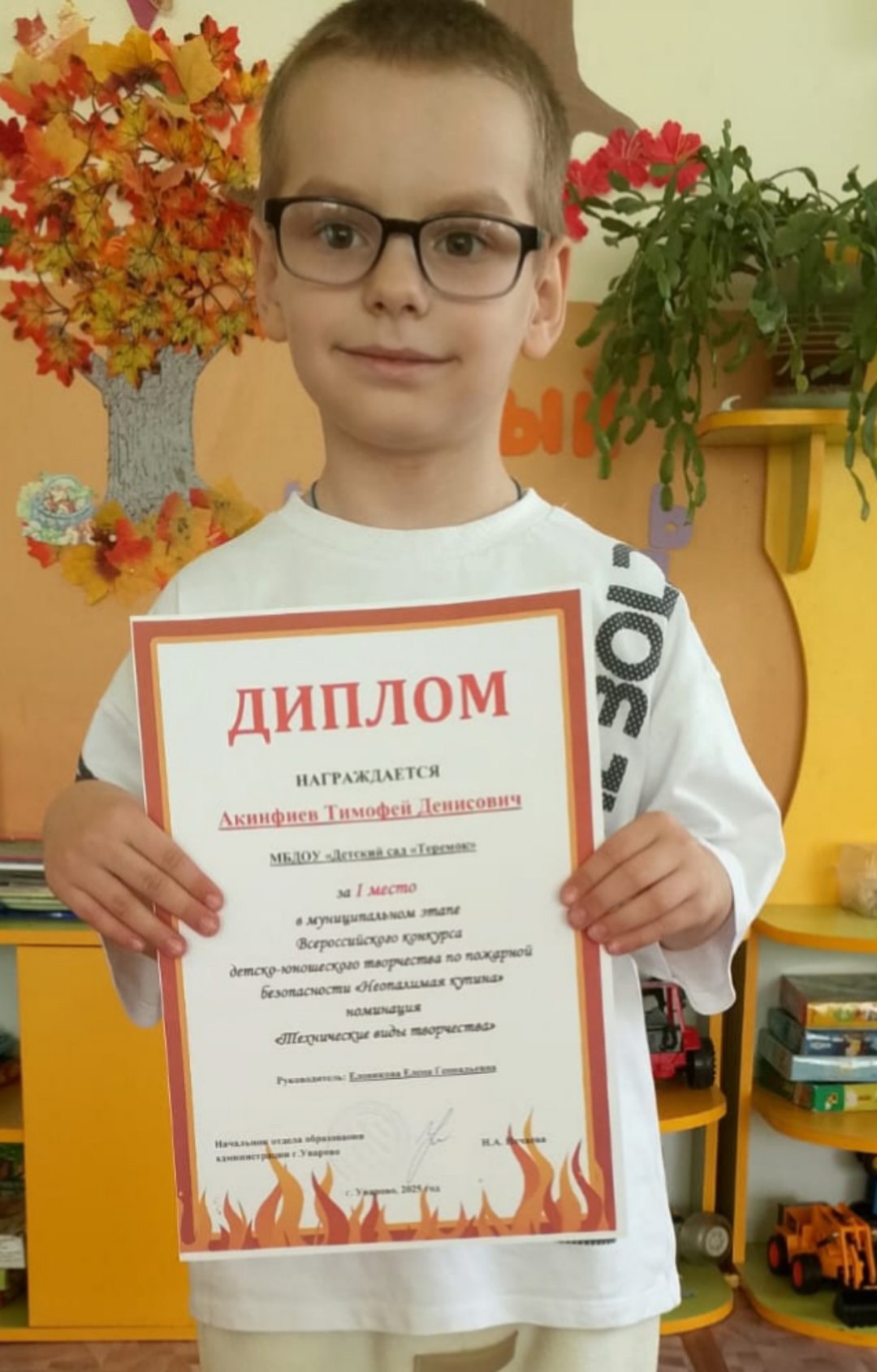 Поздравляем Акинфиева Тимофея, воспитанника старшей группы «Одуванчики» с победой в муниципальном этапе Всероссийского конкурса детско- юношеского творчества по пожарной безопасности «Неопалимая Купина» в номинации «Технические виды творчества».