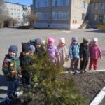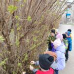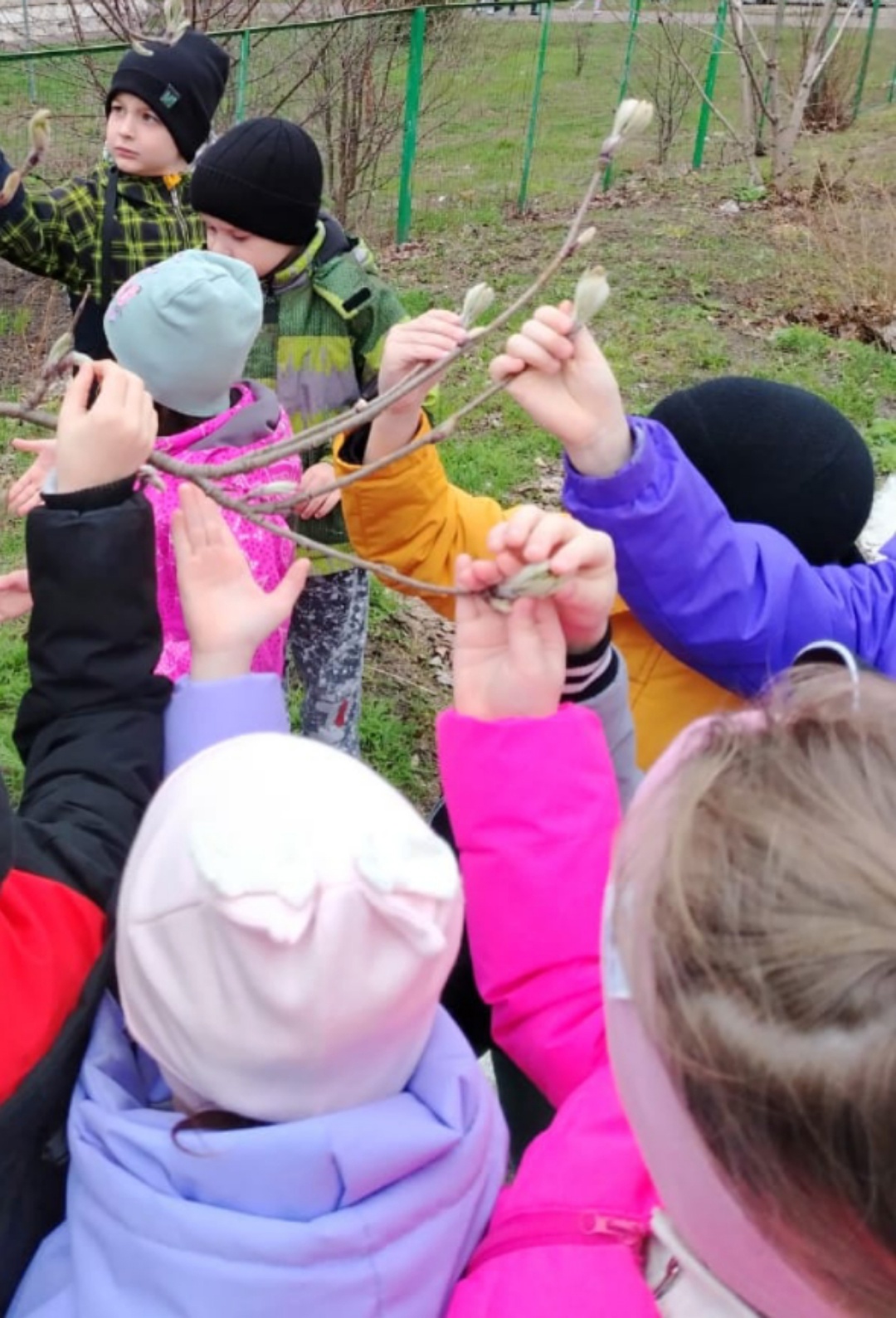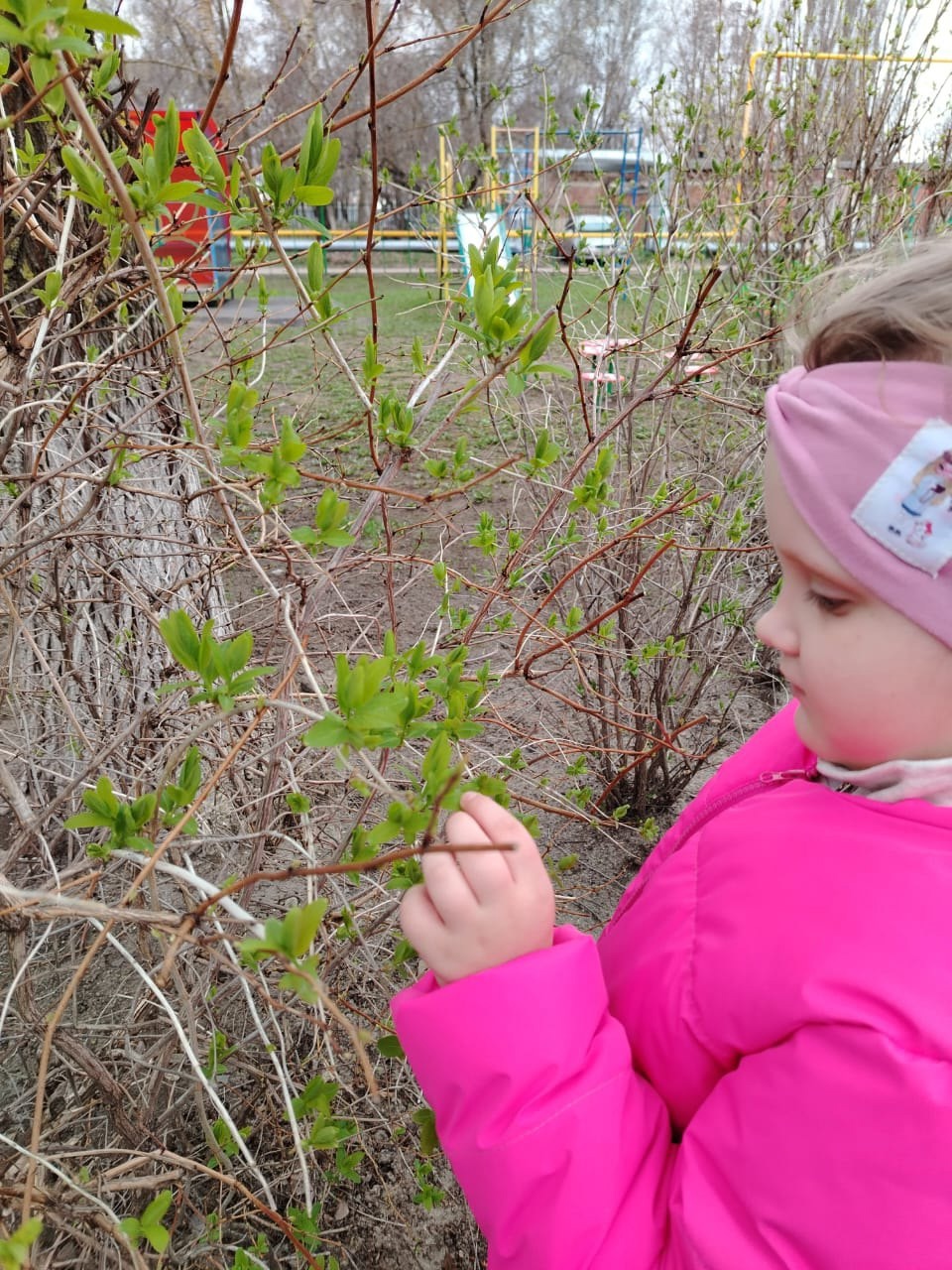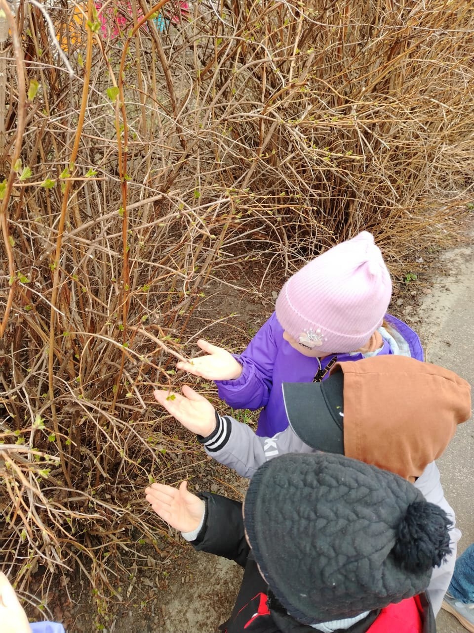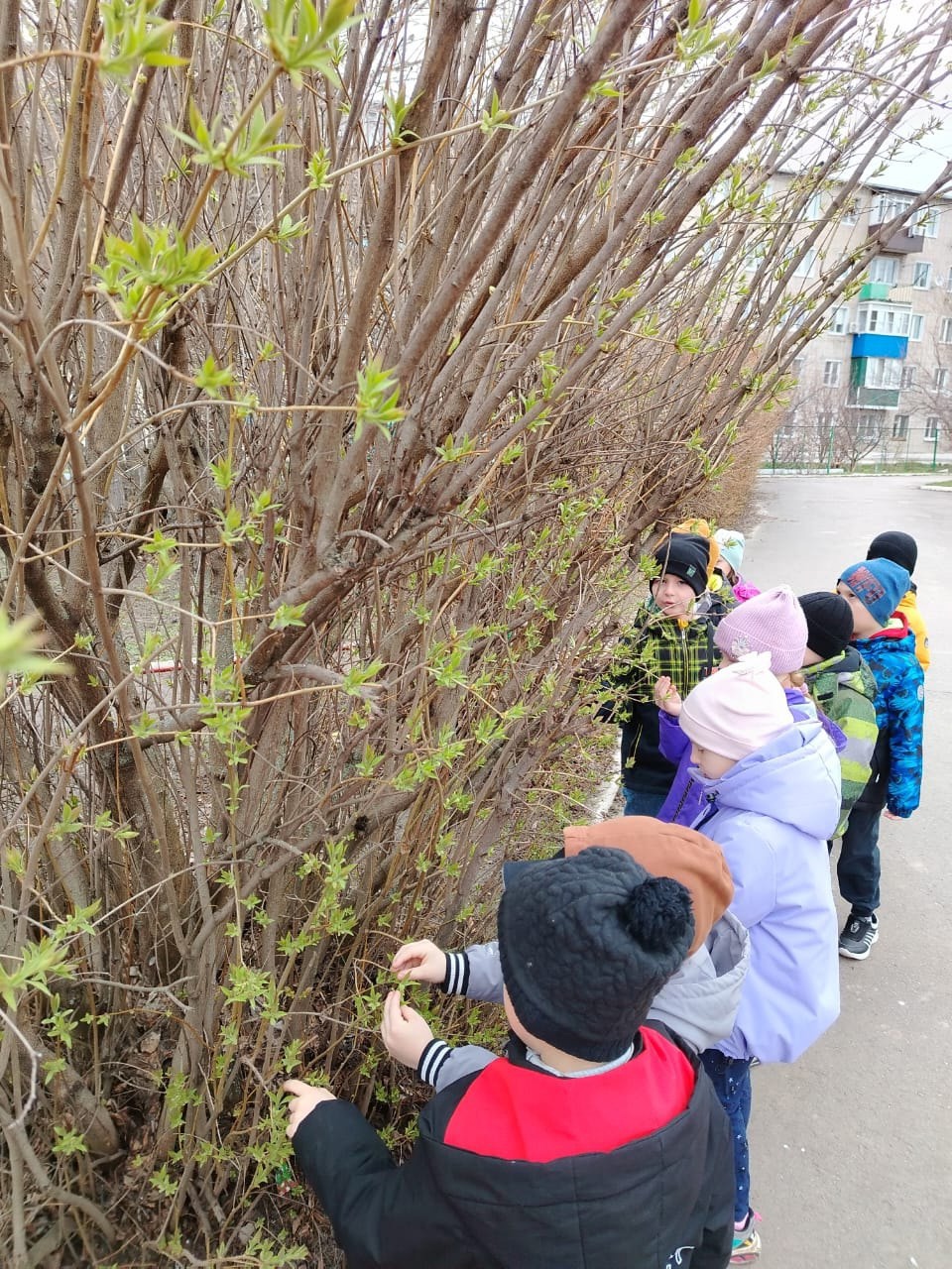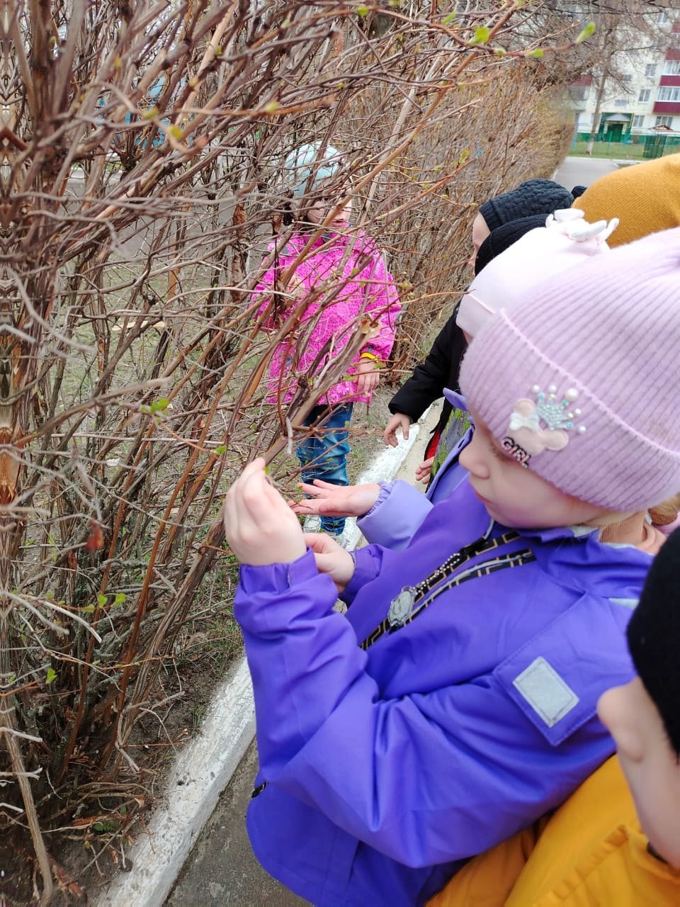 С воспитанниками подготовительной к школе группы «Ягодка» прошла тематическая прогулка «Весна-красна», ребята прошли по экологической тропе участка детского сада, наблюдали завесенними изменениями деревьев кустарников (яблоней, рябиной, сиренью, березой). Рассмотрели почки, сравнили на каких деревьях из почек начали распускаться листочки.