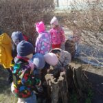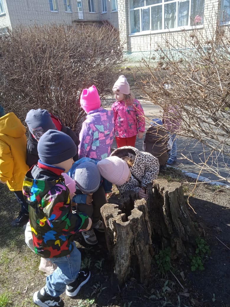 Дети прошли по территории детского сада наблюдали за кустарниками, за первыми листочками проклбнувшиммся на цветочных клумбах. На одном из участков внимание ребят привлек старый пень с его обитателями клопами солдатиками. Вместе с воспитателем дети выяснили и сделали вывод, что по окраске клопы-солдатики похожи на божью коровку.