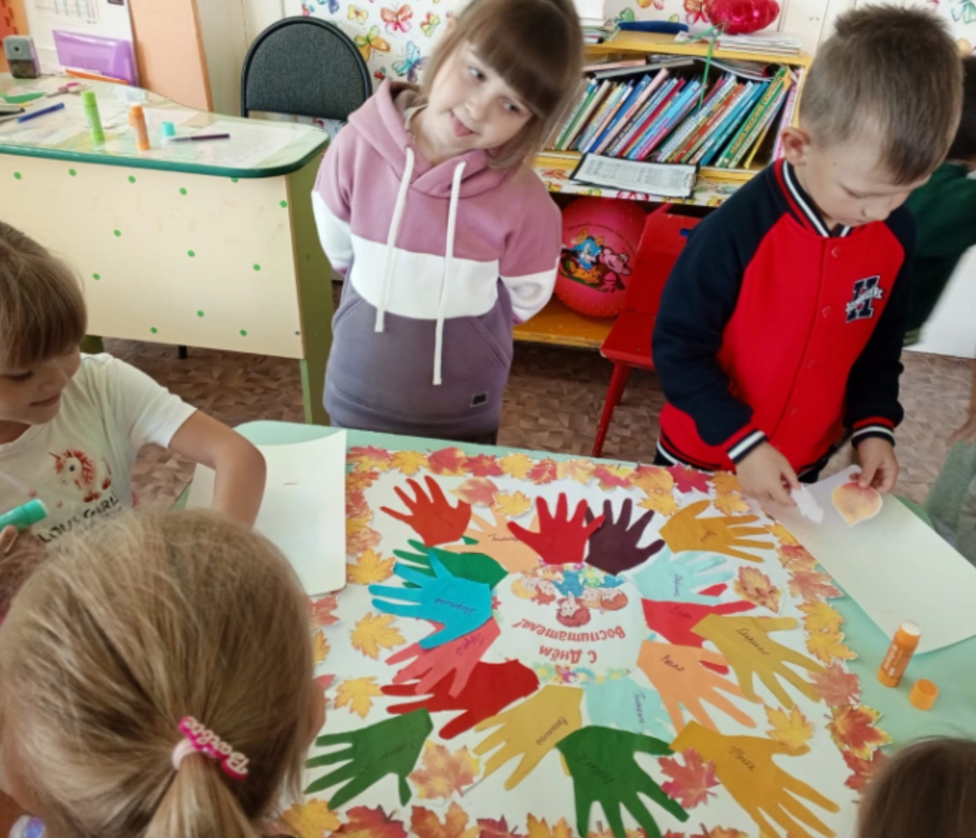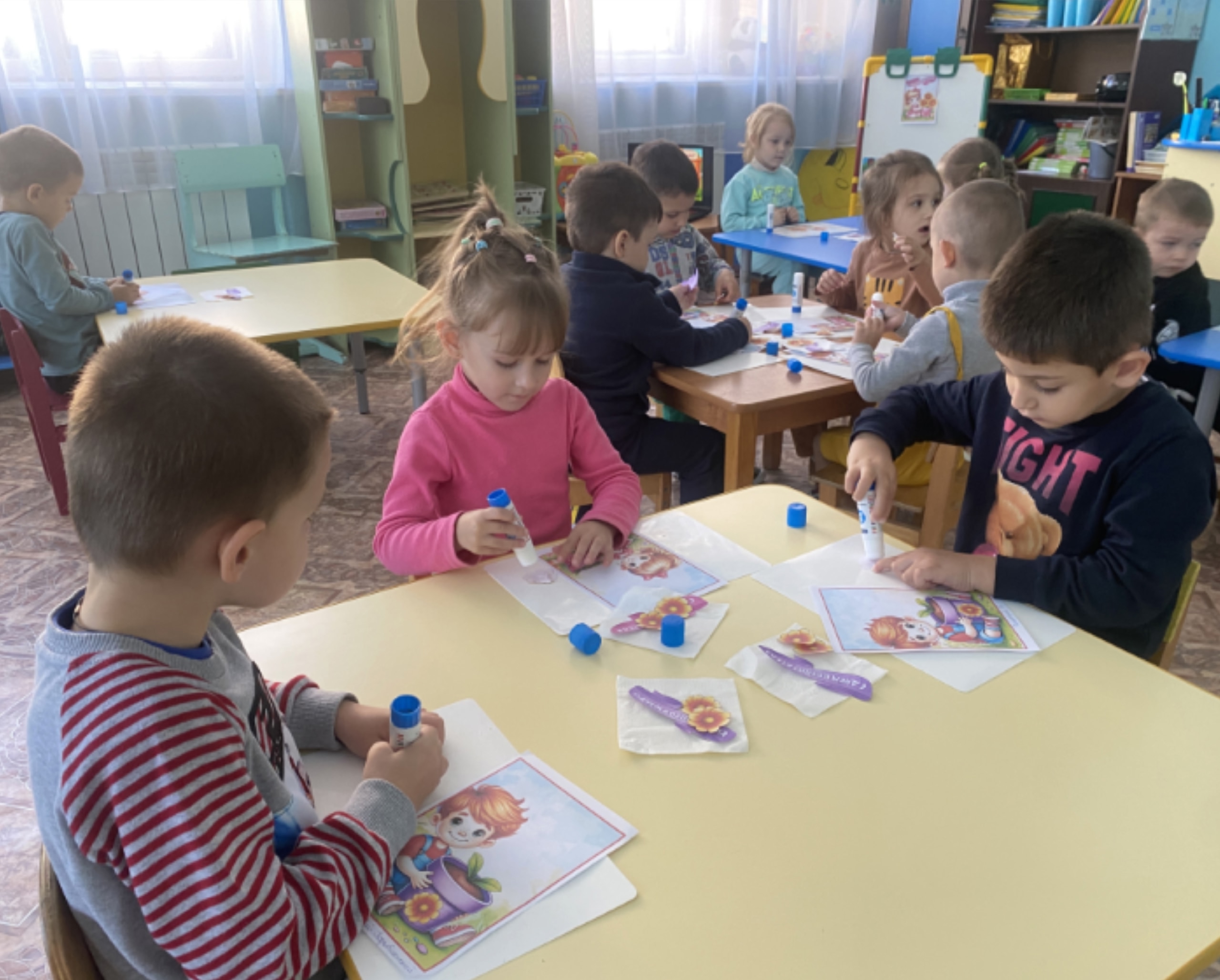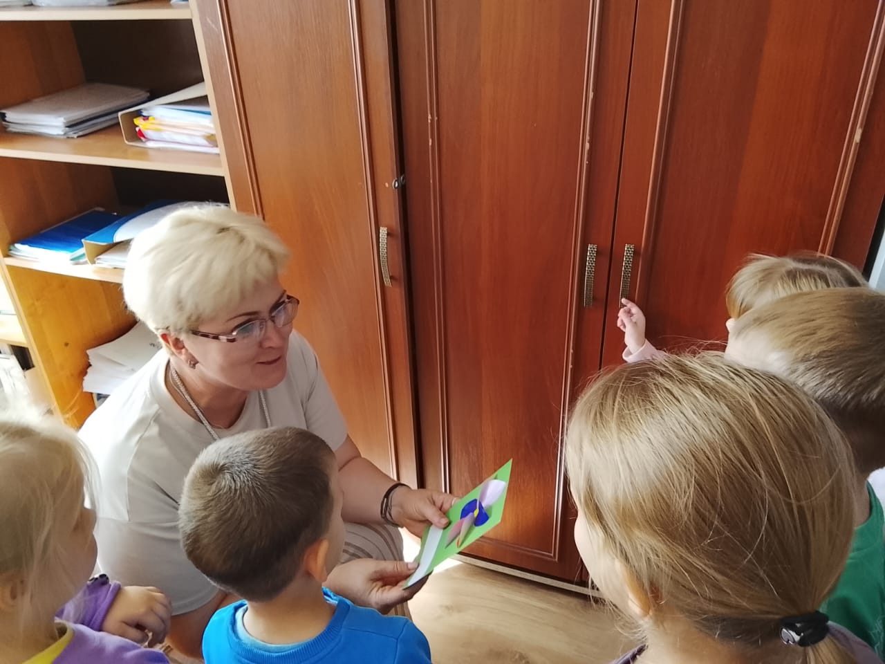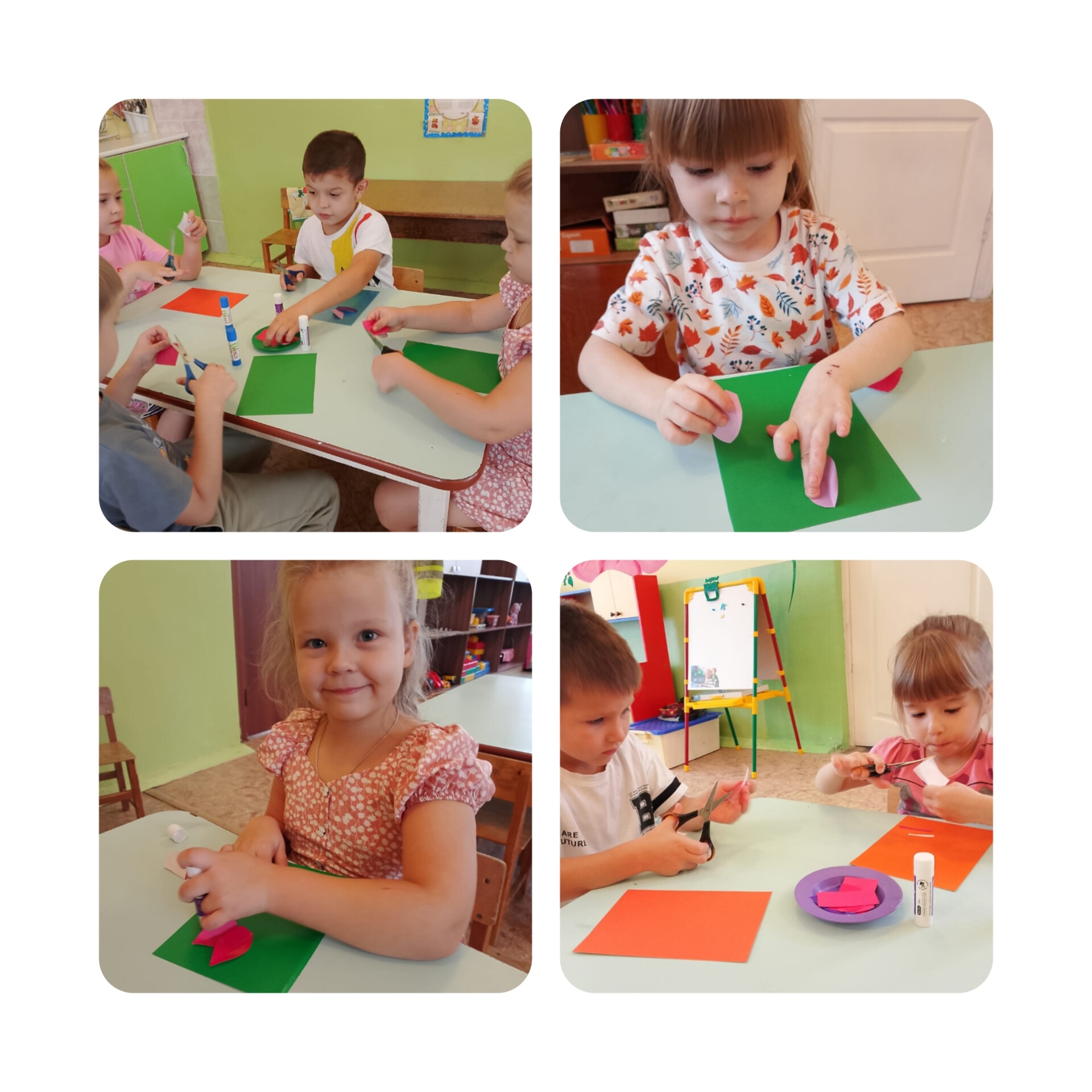 Во второй части занятия воспитанием решили порадовать своих воспитателей и младшего воспитателя сделали коллективный подарок- яркую и красочную открытку — аппликацию!