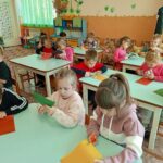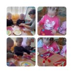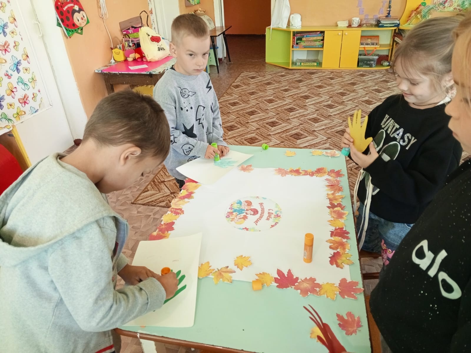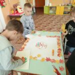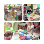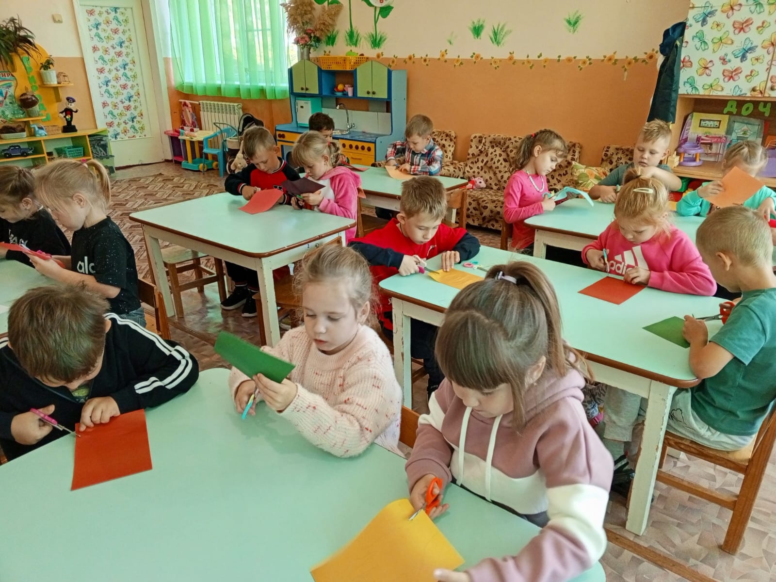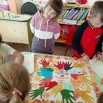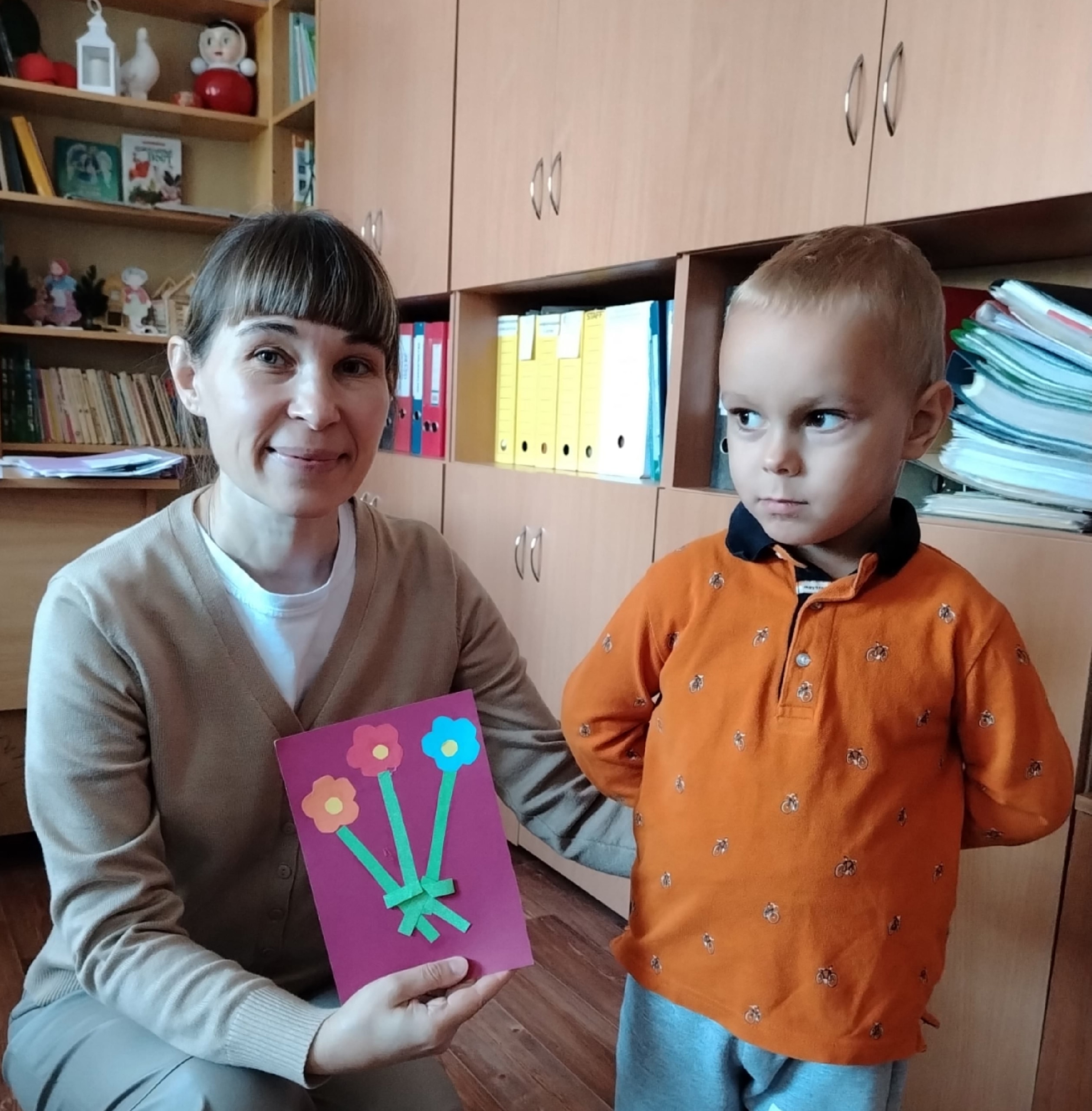 Во второй части занятия воспитанием решили порадовать своих воспитателей и младшего воспитателя сделали коллективный подарок- яркую и красочную открытку — аппликацию!