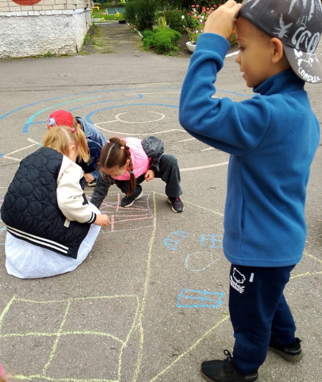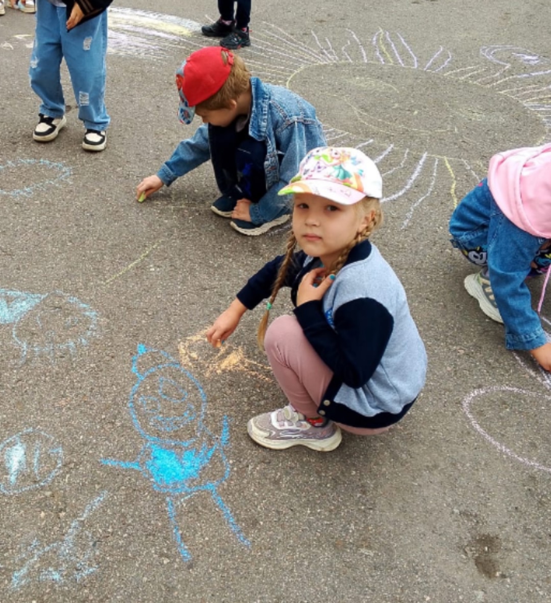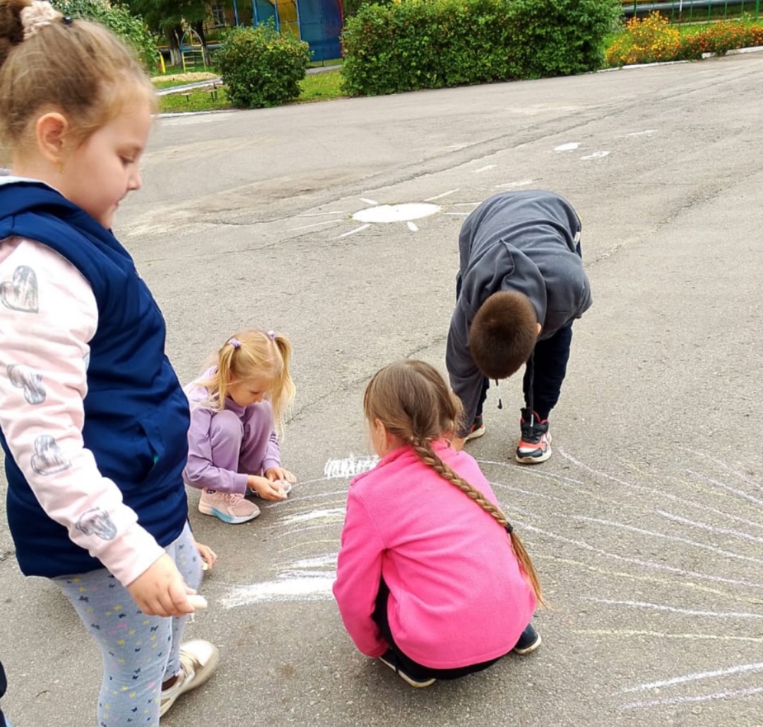 На прогулке все дружно рисовали мелками на асфальте картину «Пусть всегда будет солнце!»