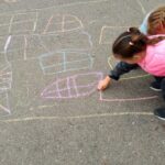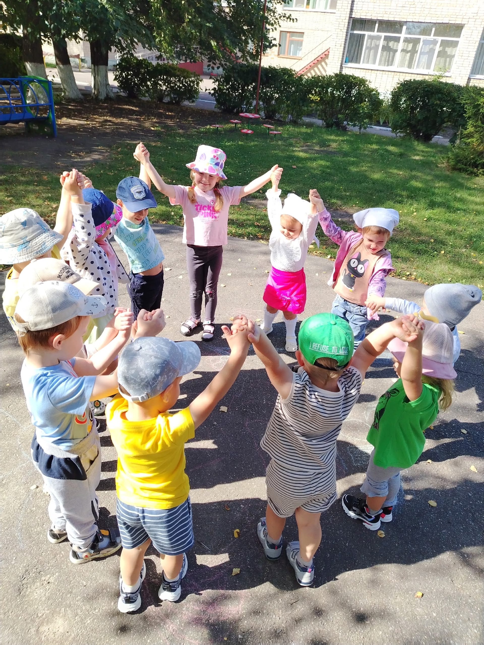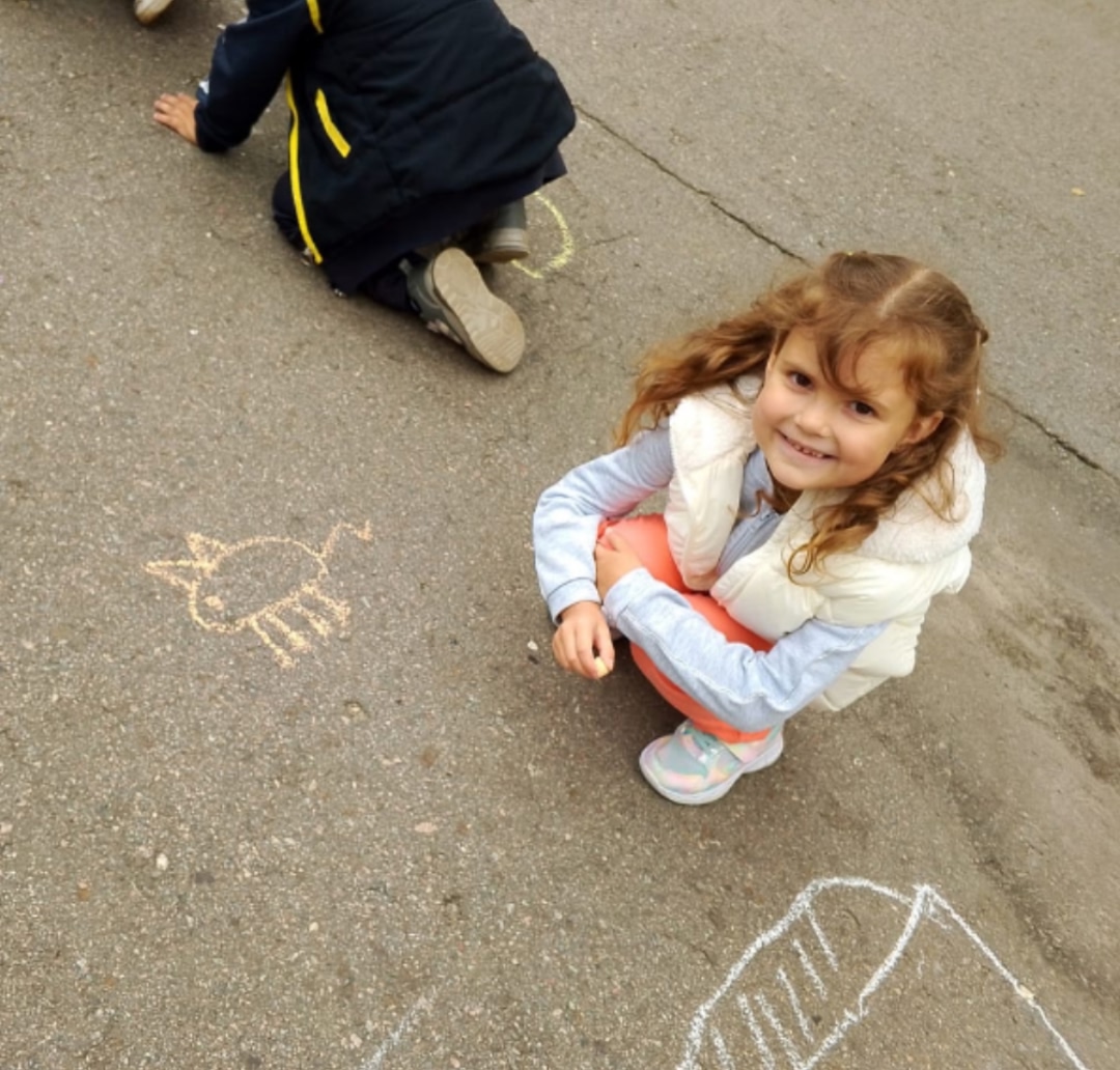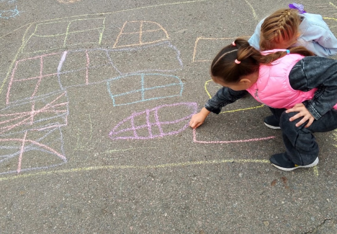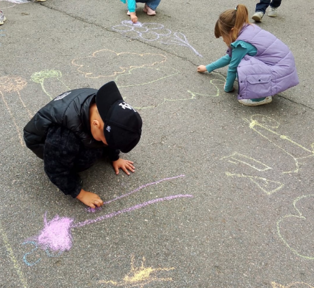 На прогулке все дружно рисовали мелками на асфальте картину «Пусть всегда будет солнце!»
